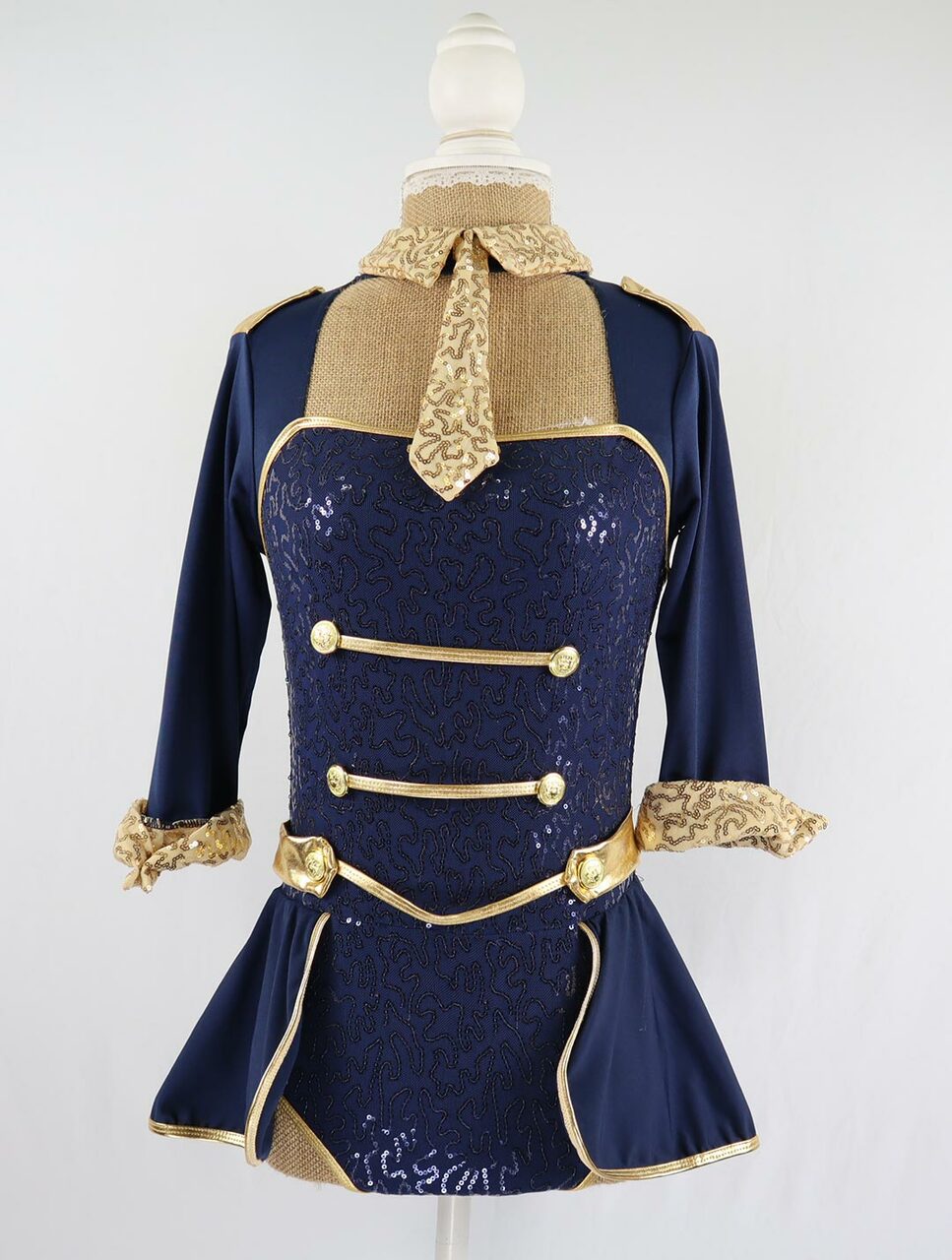 Gorgeous fully sequinned costume. Navy blue leotard with gold detail. Gold sequin epaulettes, tie and collar.