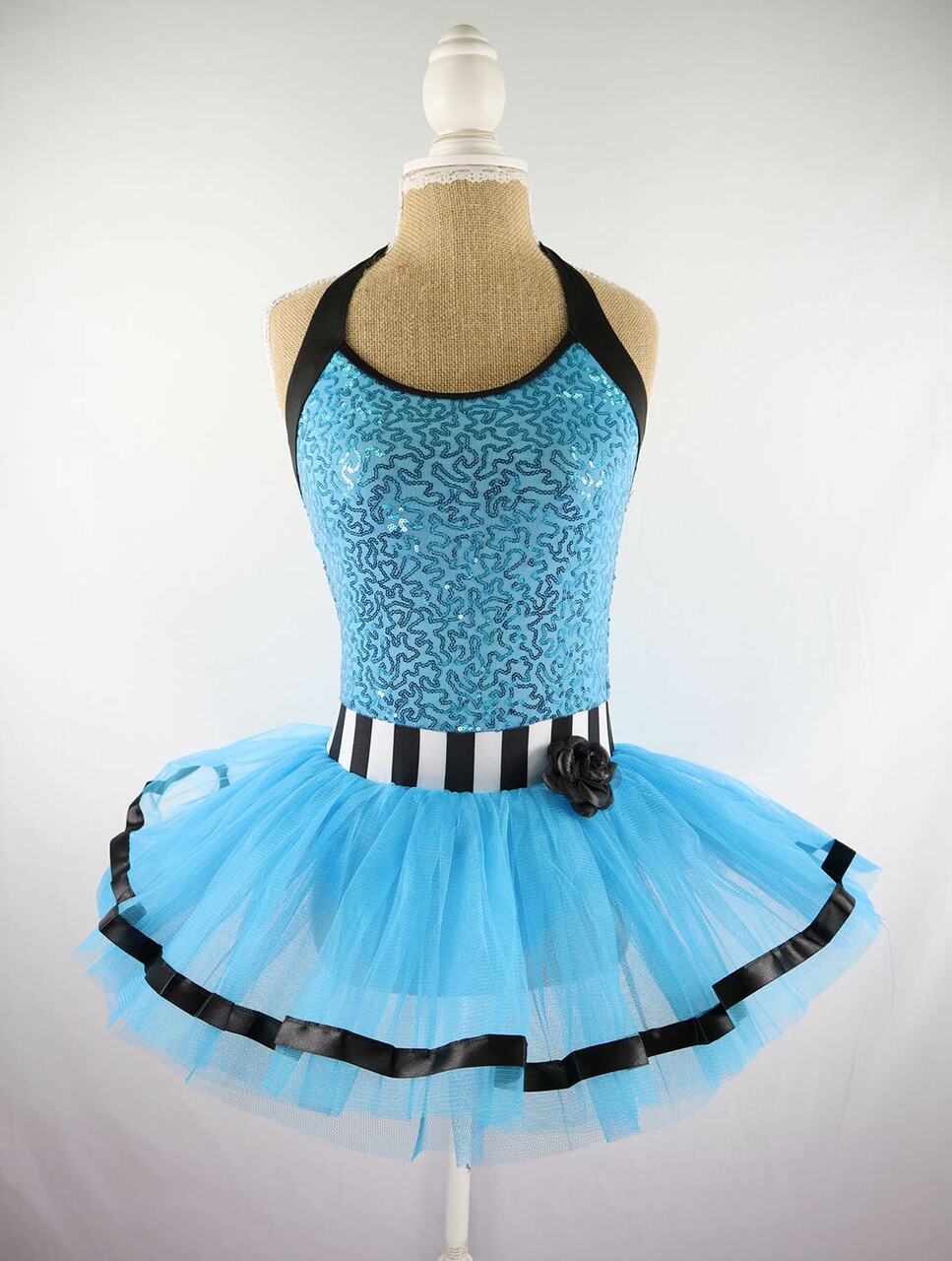 Stand out, blue sequin halterneck tutu with black lace trim and detachable flower detail.